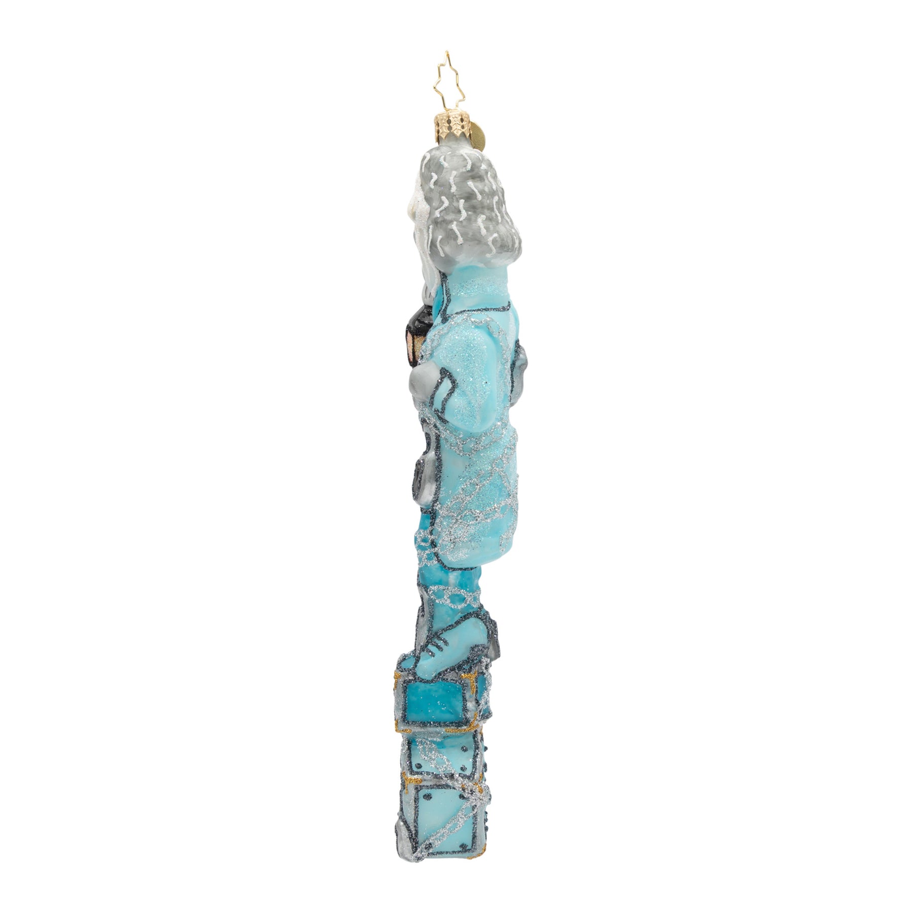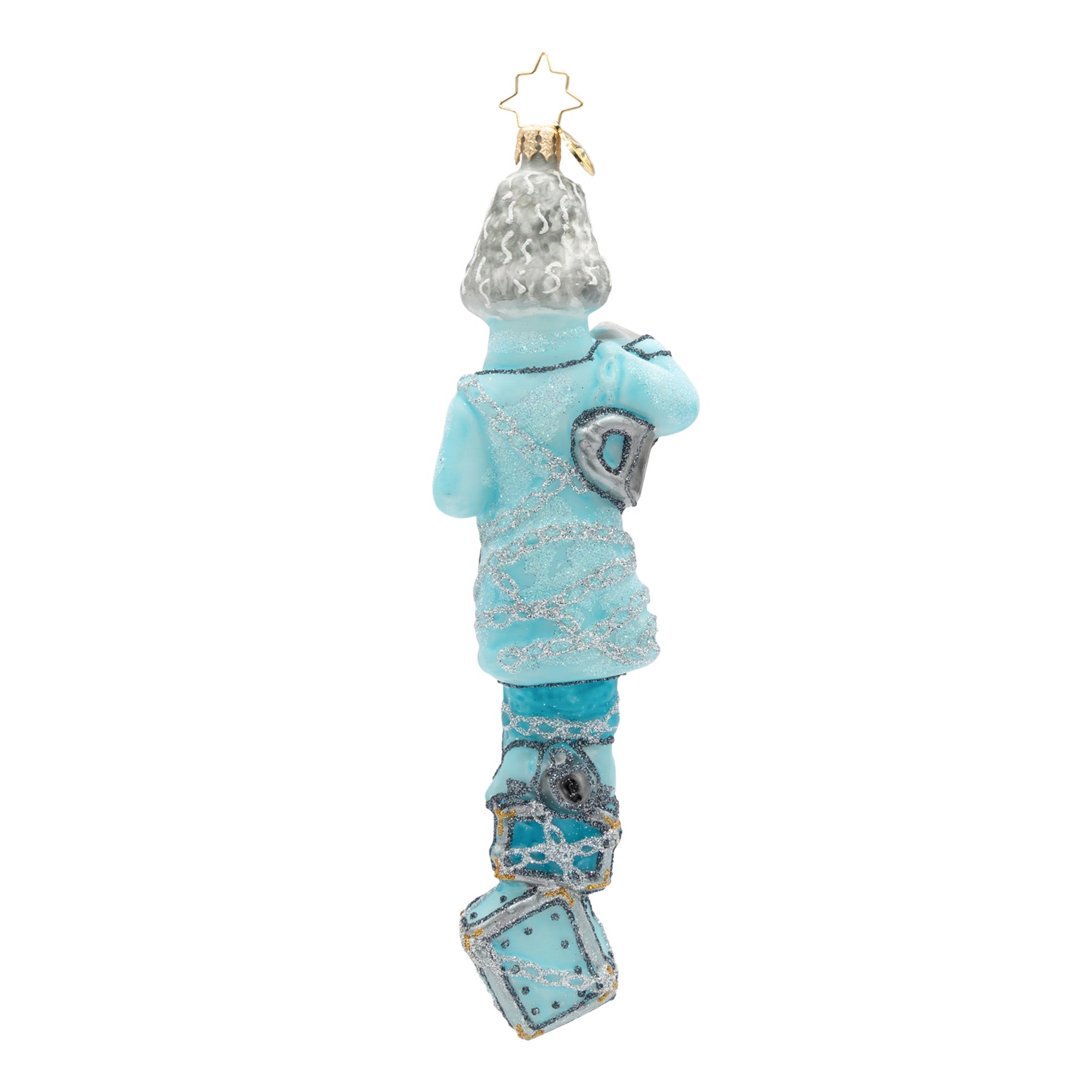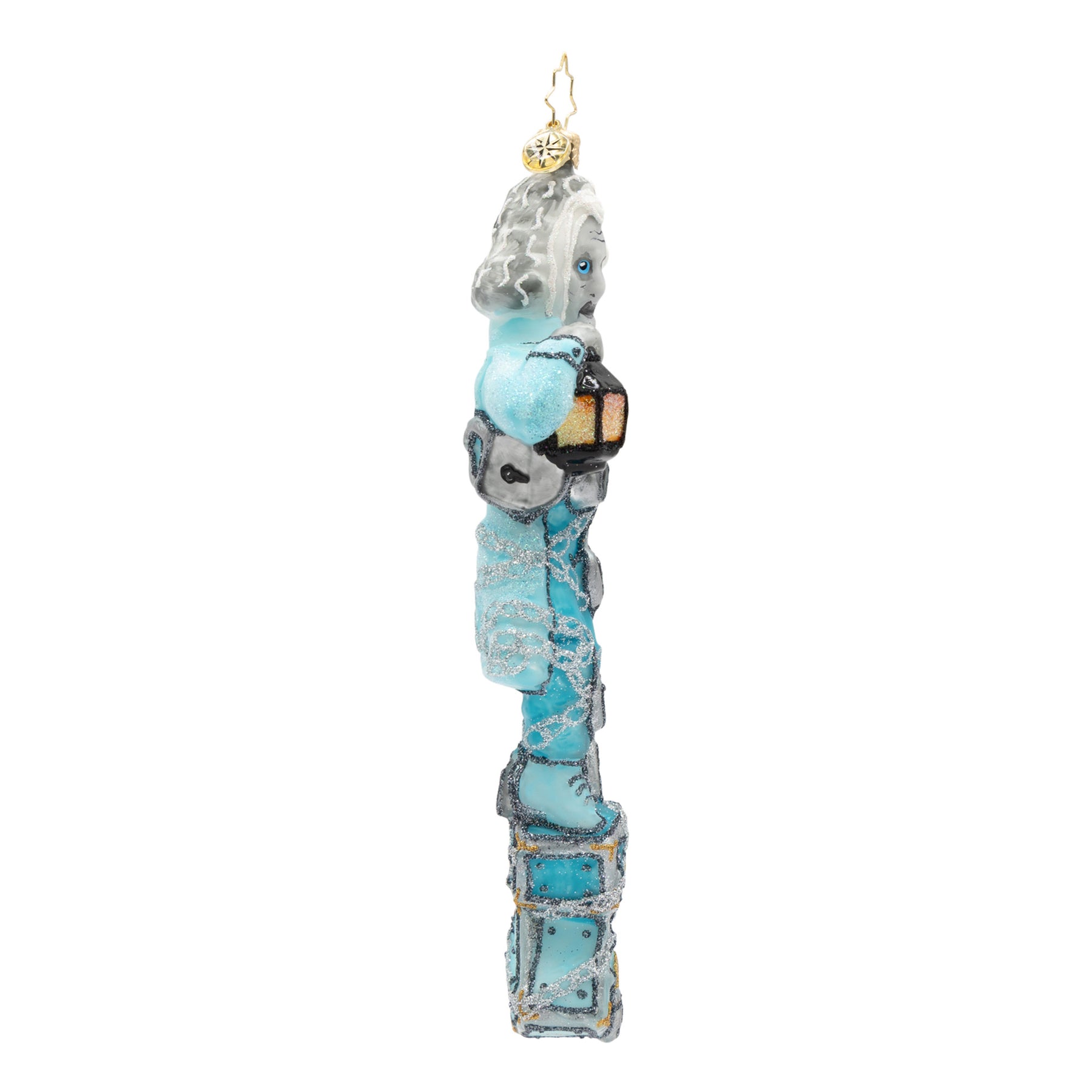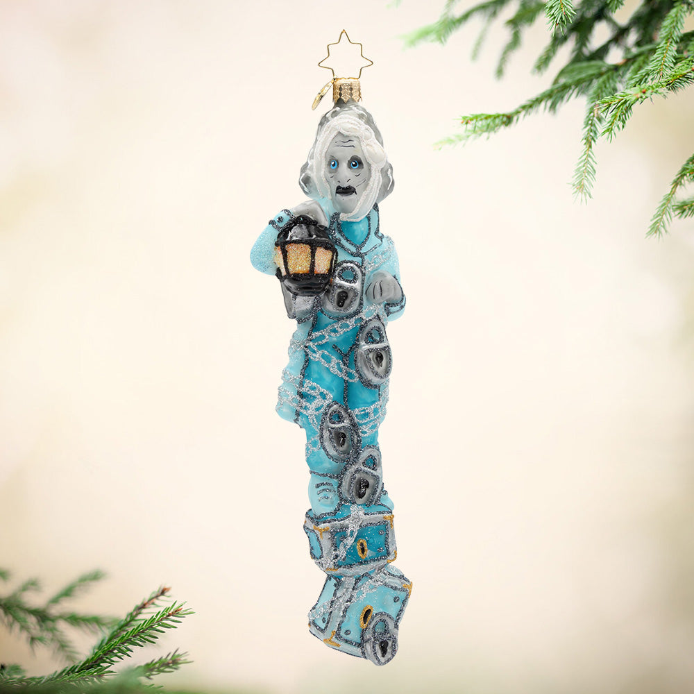Snowy and the Cardinals Gem. Ornament of Jacob Marley in q blue suit while wrapped in silver chains and holding a lantern. View of front.
