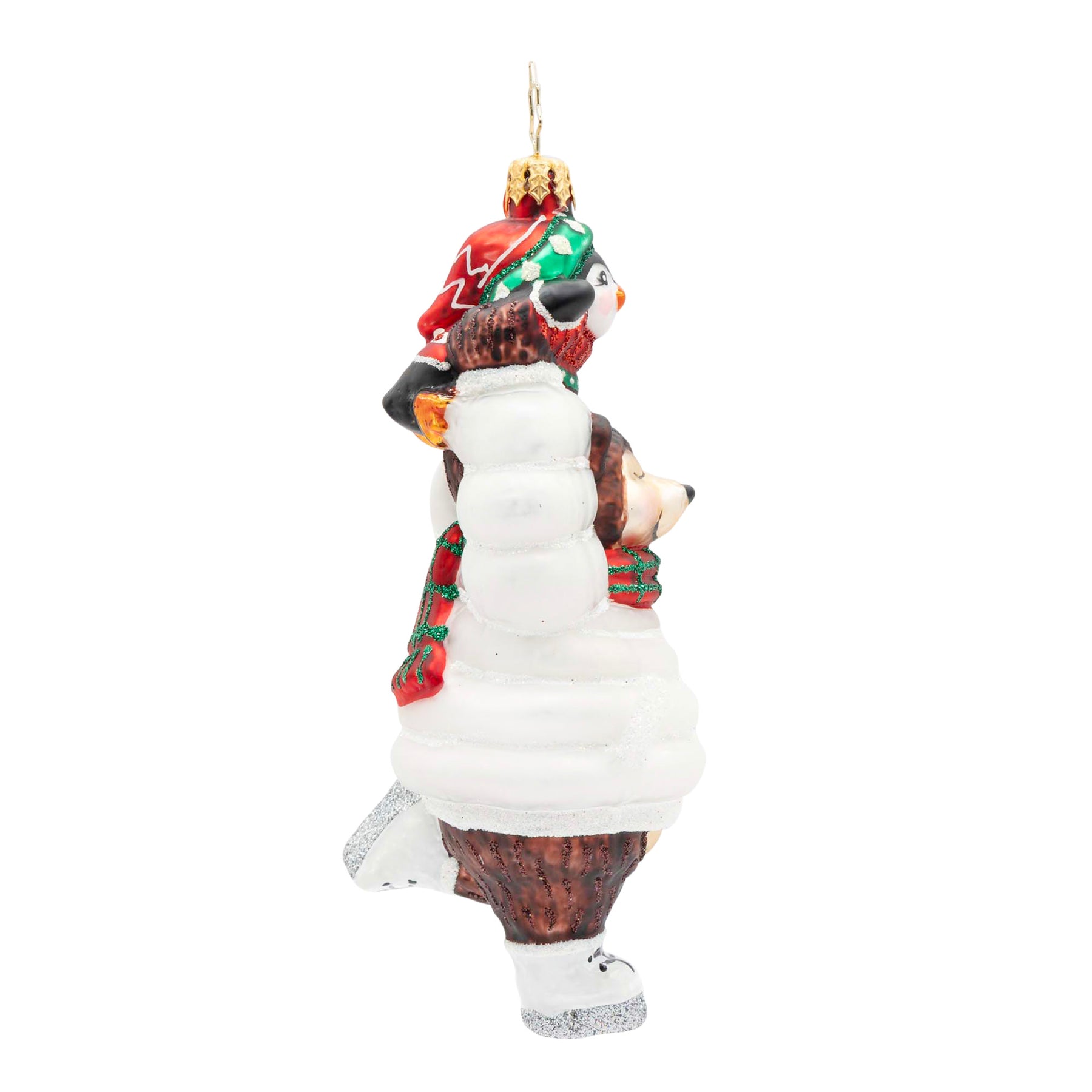 Bearly Skating. A skating bear ornament in a white coat, carrying a little penguin, who is wearing a red sweater, over its head. View of front.
