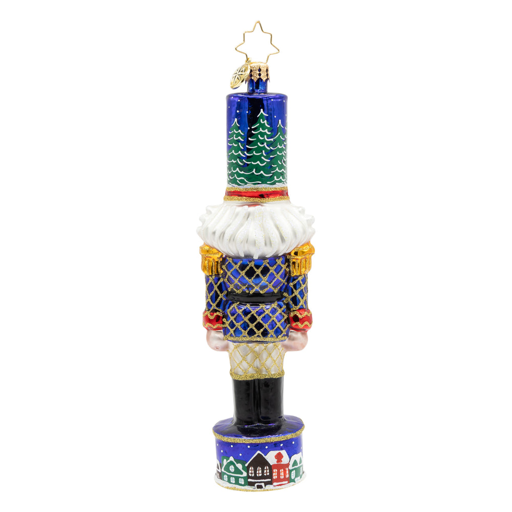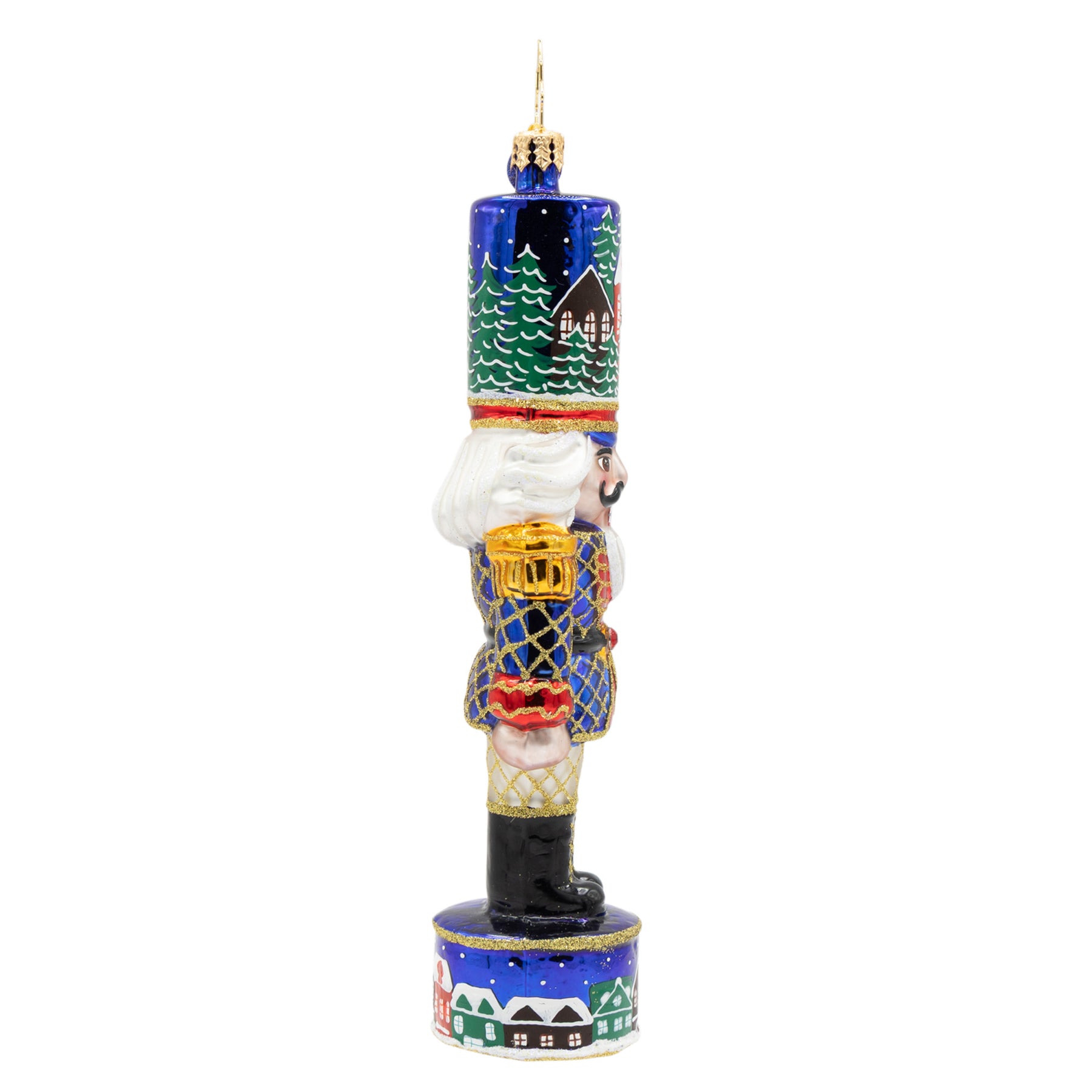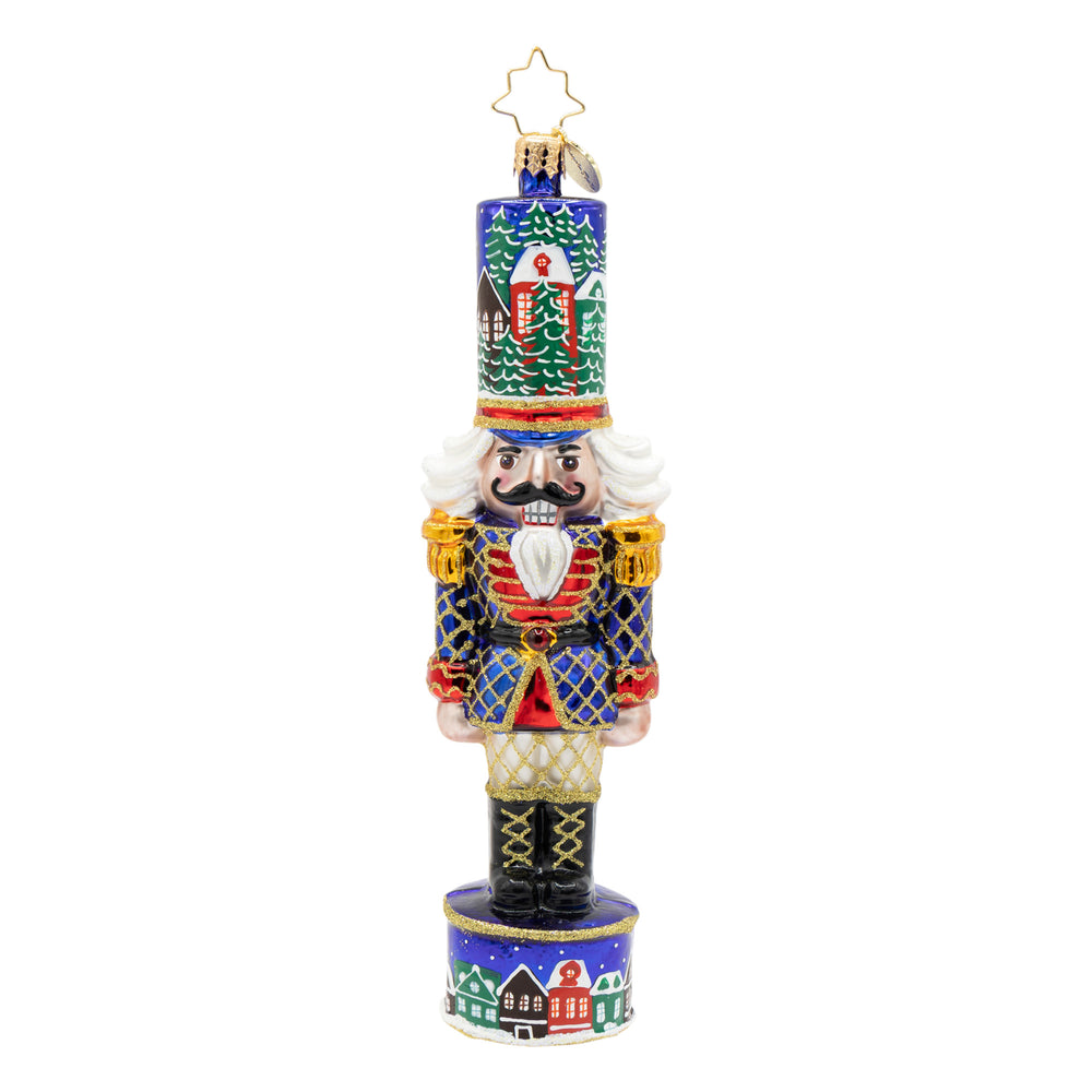 A charming nutcracker dressed in royal blue, guarding a snowy village painted right on his hat and boots. With glittering gold details and a twinkle in his eye, he’s ready to keep your Christmas cozy and bright.