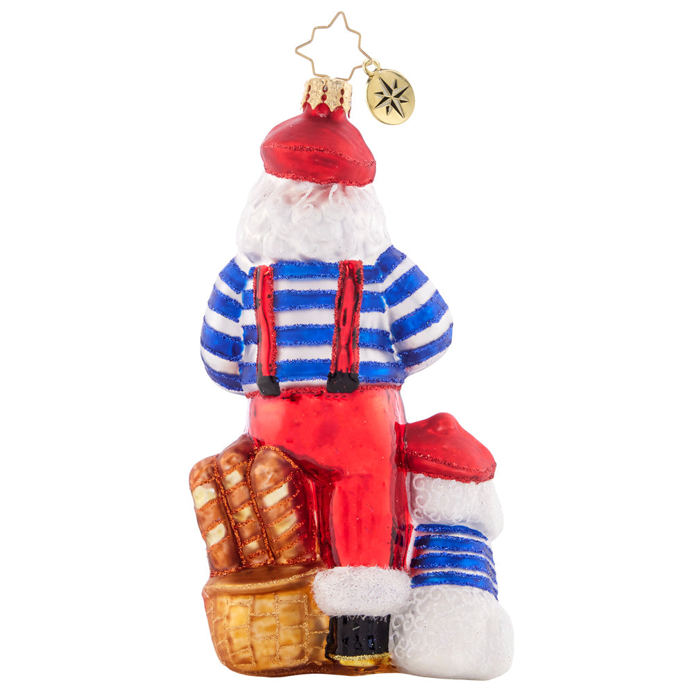Bon jour, Santa Claus! This Santa is looking perfectly posh and Parisian, complete with a bundle of baguettes and a poodle puppy. Joyeux Noel, indeed!