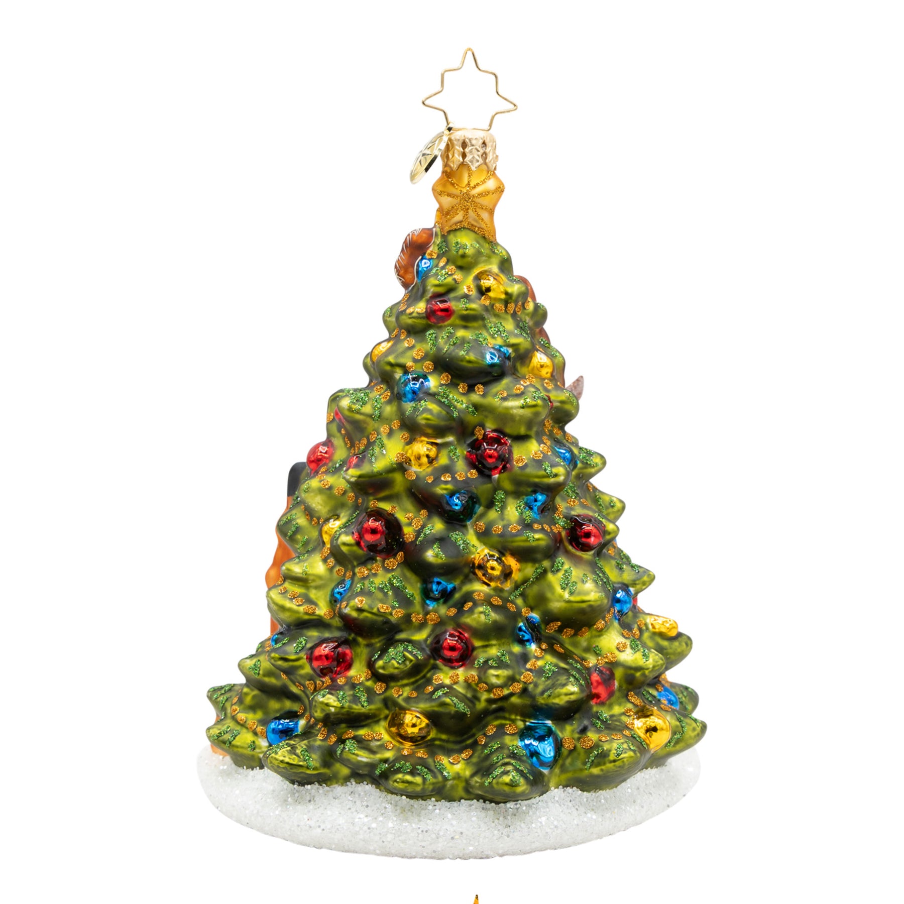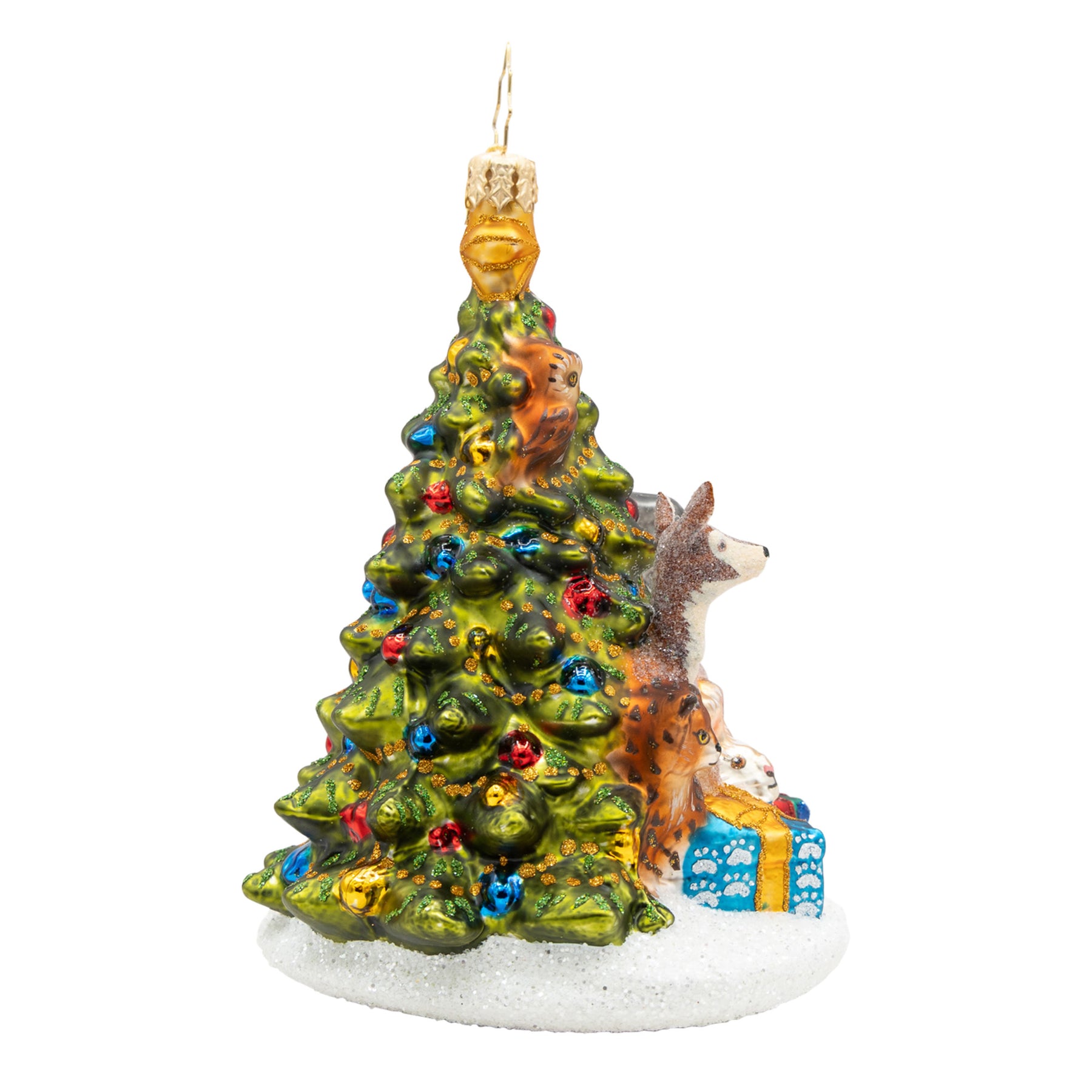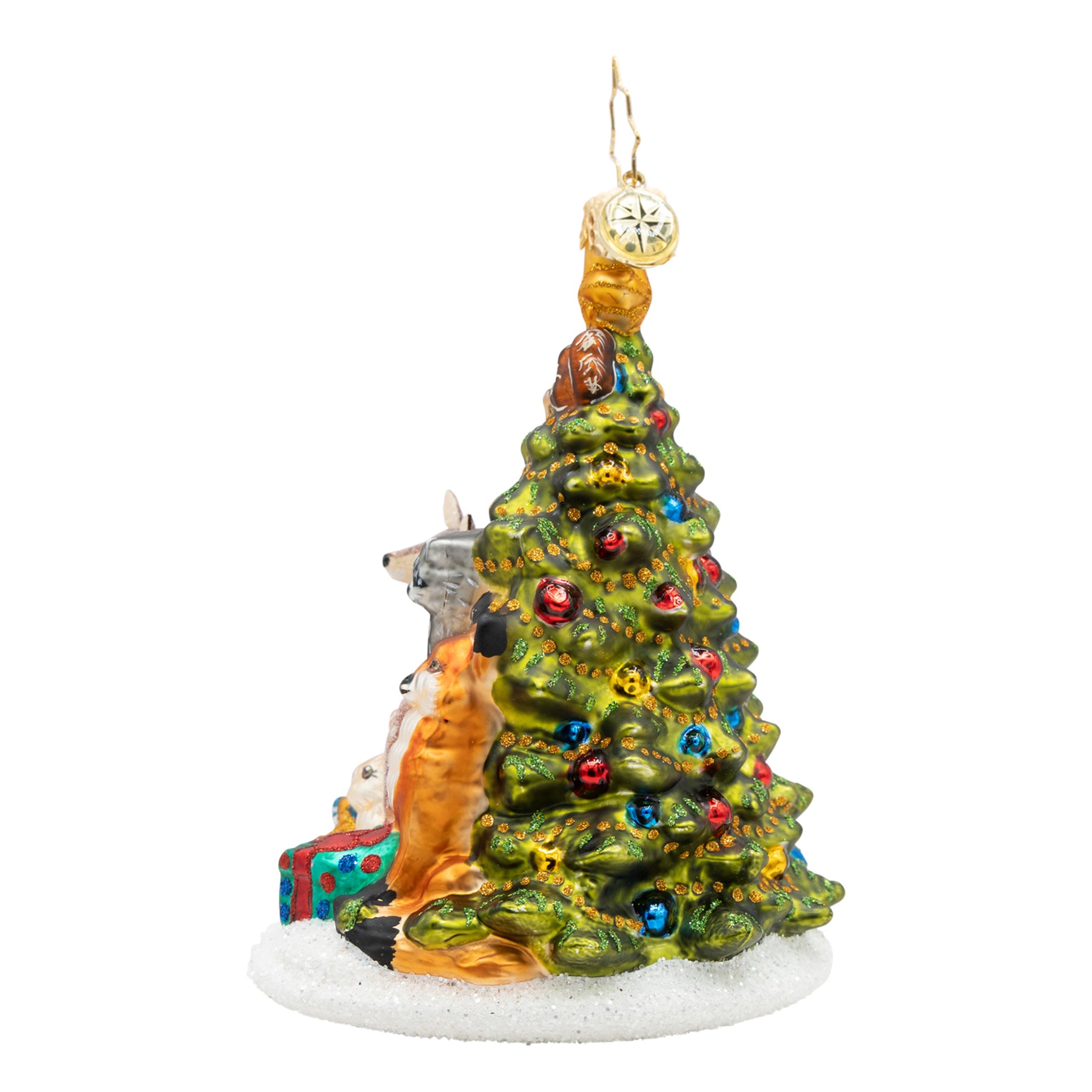 Woodland Celebration. Ornament of a decorated Christmas tree surrounded by a fox, a deer, an owl, a squirrel, and a bunny, all nestled among colorful gifts. View of front